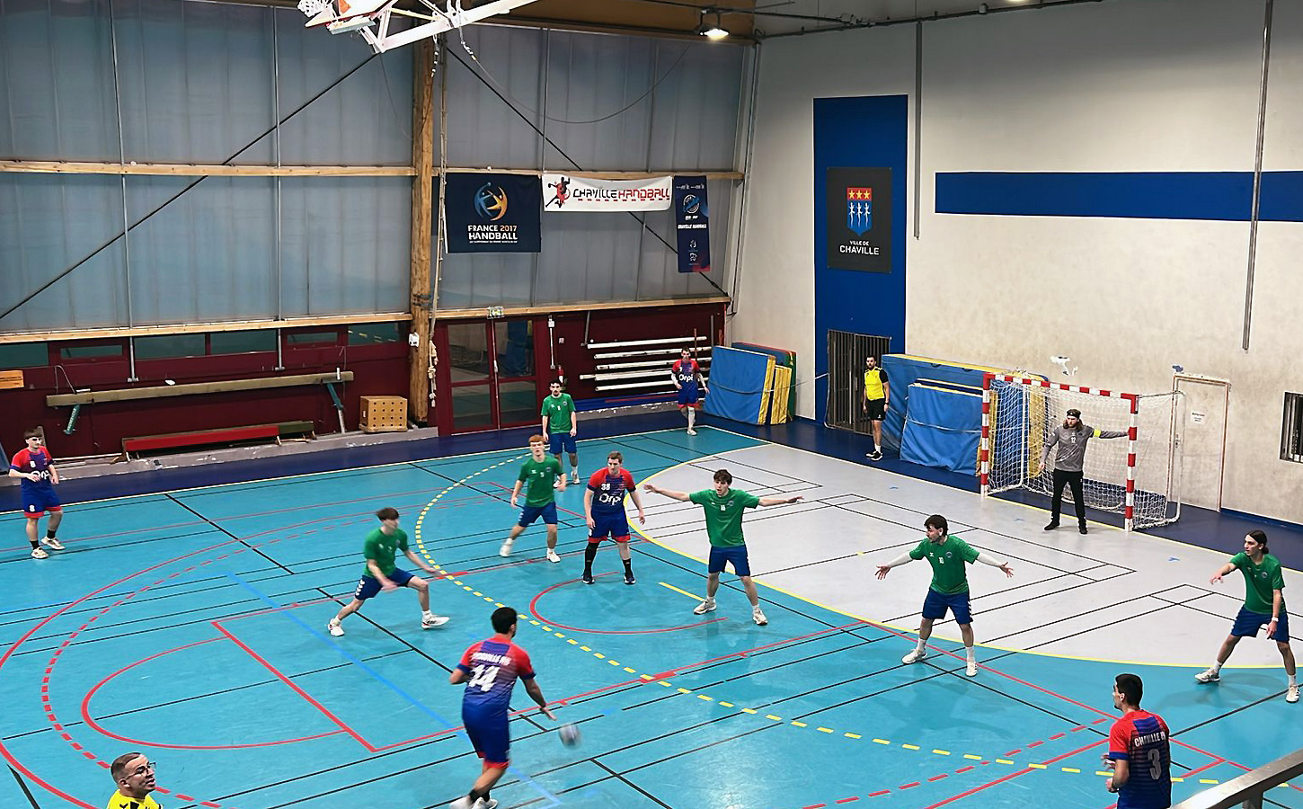 Les Bleus (en vert pour l’occasion) démarrent mal, se précipitent en attaque, perdent plusieurs ballons immédiatement sanctionnés par les contres adverses, qu’ils n’arrivent pas à anticiper (6 – 12, 16ème).